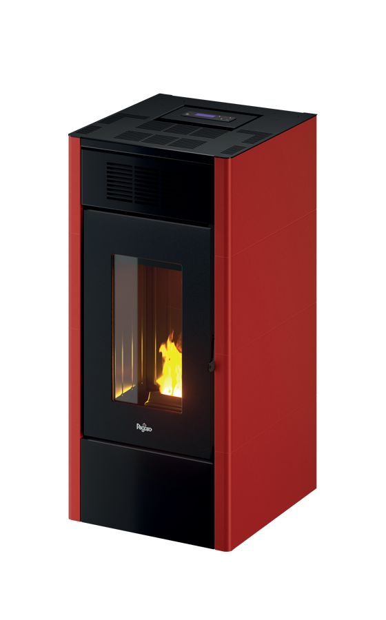 Stufa a pellet canalizzabile da 14 kW con possibilità di riscaldare l’ambiente in cui è installata ed altri adiacenti. Rivestimento in acciaio verniciato.